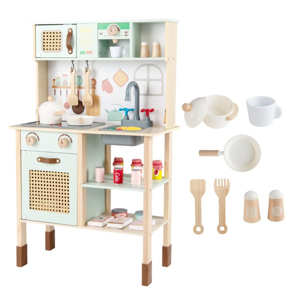 ● Focus on Little Ones' Safety: With its rounded corners and pine wood legs equipped with protective covers, the ASTM/CPSIA compliant wooden play kitchen for toddlers prioritizes safety and ensures reliable stability. Moreover, constructed from sturdy wooden boards, this play set also offers long-lasting use to accompany kids' growth.