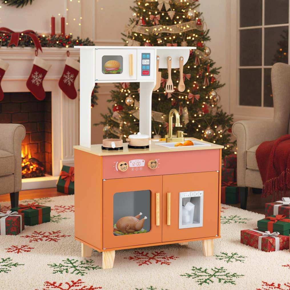 All-in-One Play Kitchen: This wooden play kitchen packs a microwave, swivel faucet sink, 2-burner stove, and a 5-piece cookware kit so kids can cook, clean, and serve just like grown-ups. The interactive ice dispenser adds extra realism—load it with cubes and press the cup to watch them tumble out.
