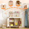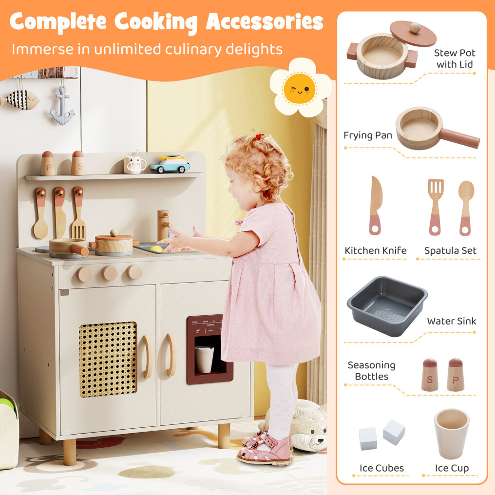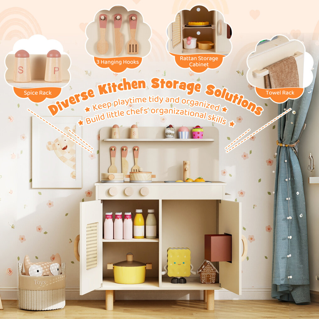 ● Diverse Kitchen Storage Solutions: Featuring a spice rack, hanging hooks for utensils, a rattan storage cabinet with a detachable shelf and a towel rack, this toddler kitchen playset offers diverse storage options to keep accessories organized. Plus, teaching tidiness becomes fun as little chefs learn to put away their cooking utensils.