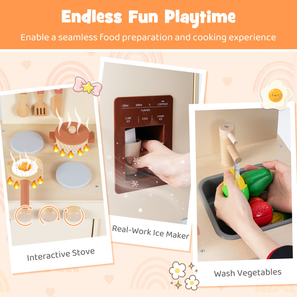 ● Endless Fun Playtime: The kids play kitchen enables a seamless food preparation and cooking experience to tiny hands, as they pretend to wash vegetables in the functional sink, cook on the interactive stove with rotatable knobs and dispense ice cubes from the real-work ice maker, fueling imagination and encouraging role-play.