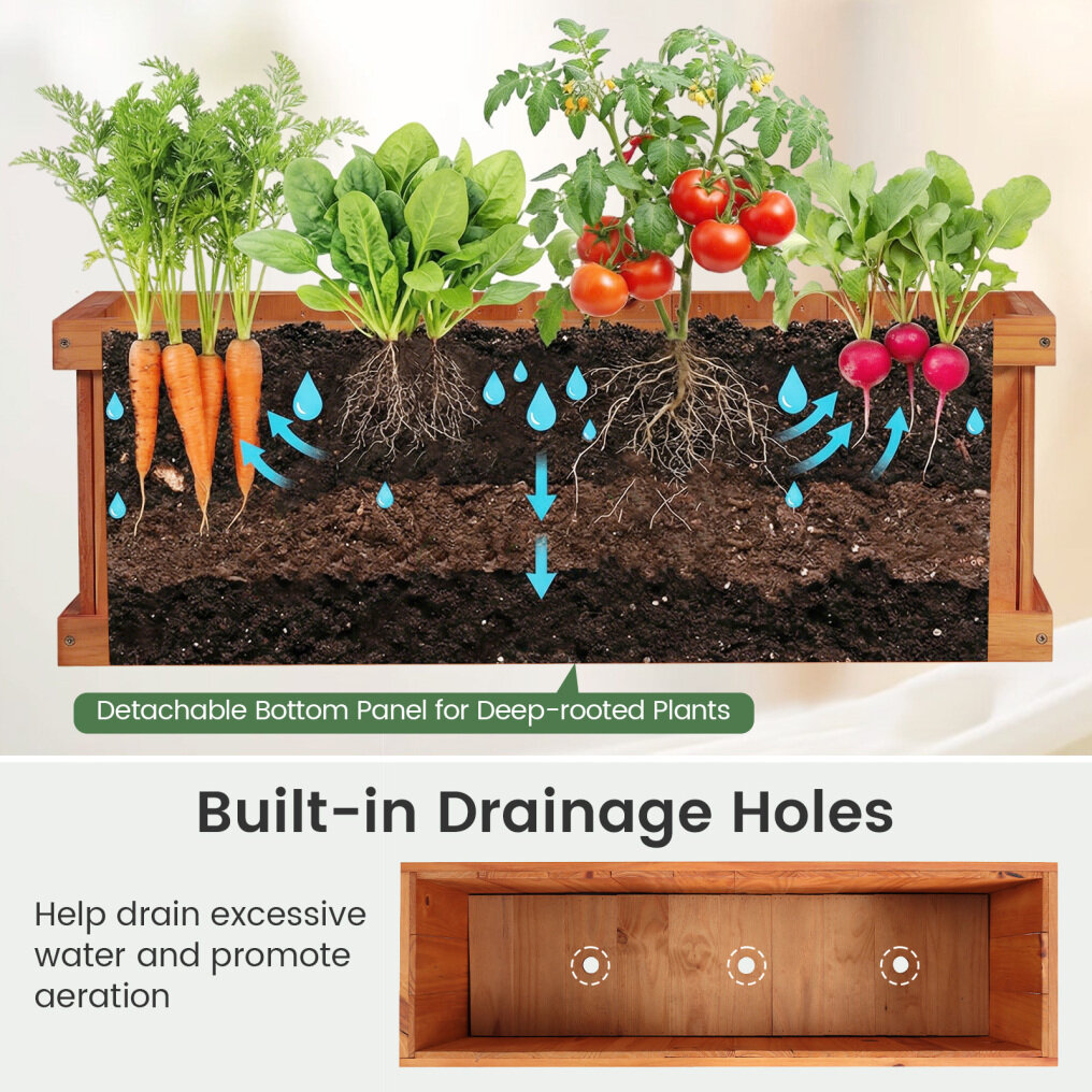 ● Versatile Planting Options: The outdoor garden box is ideal for cultivating various plants, such as tomatoes, herbs, lettuces, peppers, vibrant blooms, succulents, and more. Moreover, its detachable bottom panel design is perfect for encouraging deep-root growth.