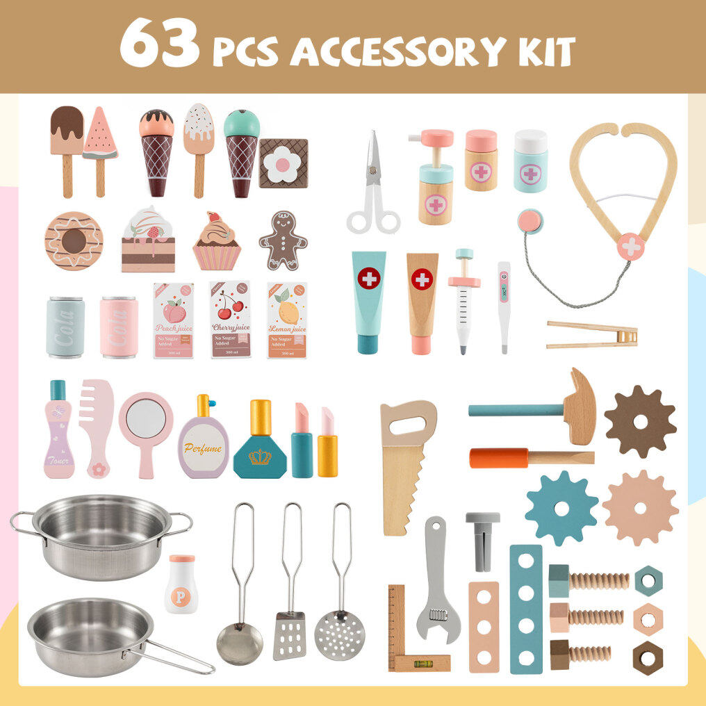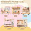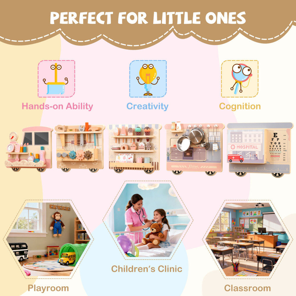 ● 5-in-1 Activity Hub: This sensory wall panel folds a vanity, toolbox, play kitchen, doctor kit and snack bar into one activity train, each with its own set of themed accessories—63 pieces in total. It invites several kids to engage side-by-side in cooperative role-play.