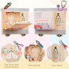 ● 5-in-1 Activity Hub: This sensory wall panel folds a vanity, toolbox, play kitchen, doctor kit and snack bar into one activity train, each with its own set of themed accessories—63 pieces in total. It invites several kids to engage side-by-side in cooperative role-play.