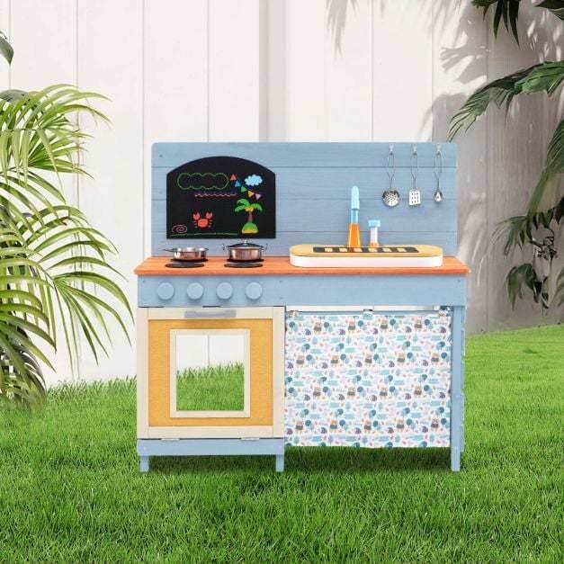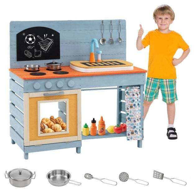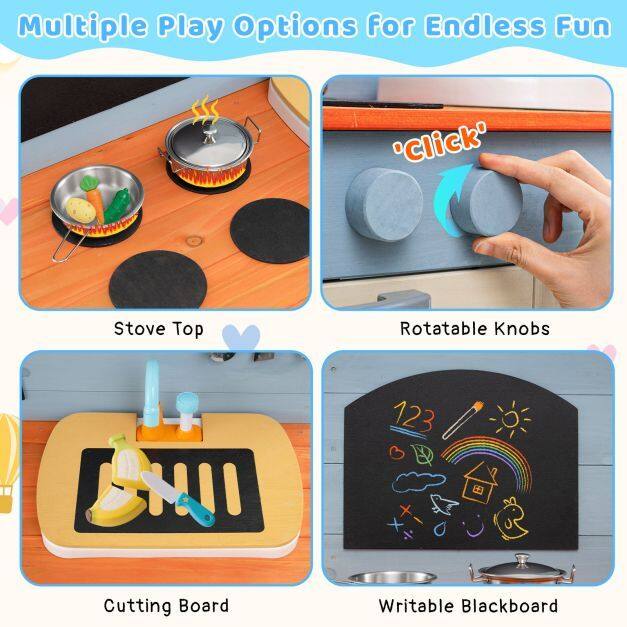 ● Cooking Fun for Little Chefs: The kids play kitchen boasts a chalkboard to write menus, 4 realistic stovetops, 4 rotation knobs that click, and a cutting board for immersive play. Complete with essential cooking tools like a pot, frying pan, spoon, skimmer, and spatula, it is an ideal learning playground for little chefs aged 3-8 years.