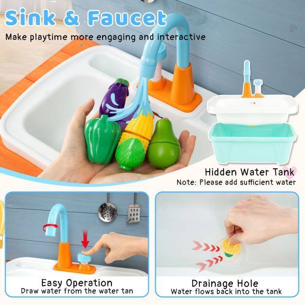 ● Innovative Water Circulation System: Watch your little ones marvel at the magic of the circulation faucet in the kitchen playset. Equipped with a hidden water tank, kids can press a button to draw water and open a drainage hole to let it flow back. This feature allows them to fully enjoy role-playing. Note: Please add enough water.